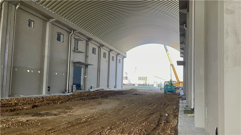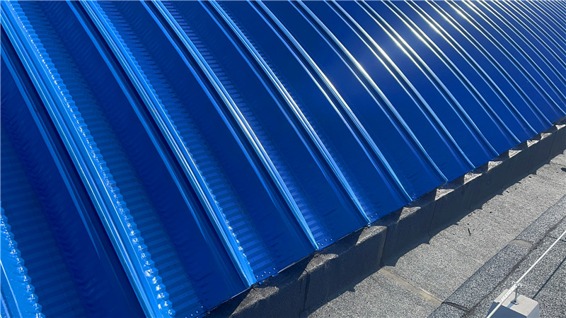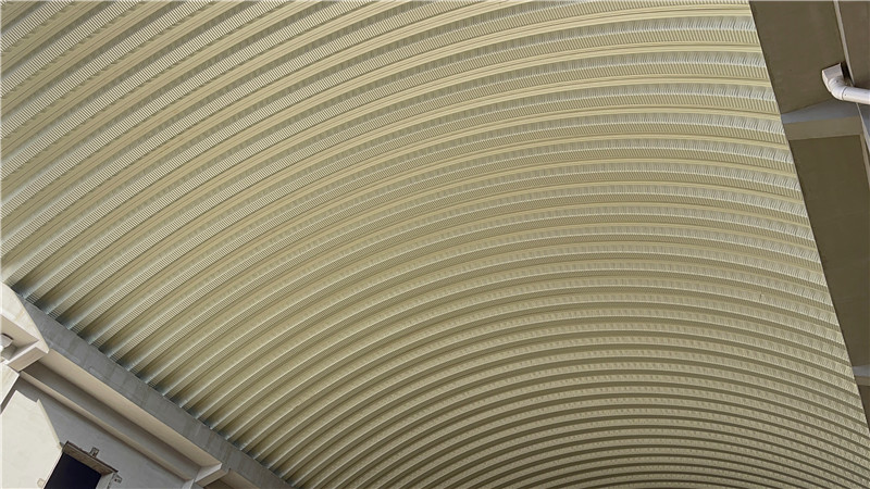 本次拱形波紋鋼屋面采用914-610型結(jié)構(gòu),拱跨18.10米,長(zhǎng)度85.82米,總覆蓋面積超1500㎡。屋面選用冠洲品牌彩涂卷,厚度1.0mm,正面海藍(lán)色、背面灰白色,兼顧耐腐蝕性與視覺協(xié)調(diào)性。