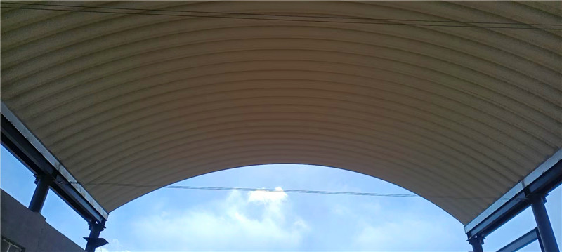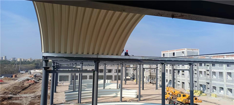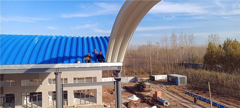 屋頂采用的板材為TS280GD-Z高強(qiáng)度鍍鋅鋼板,厚度1.0mm,寬度914mm,具備良好的抗腐蝕性與強(qiáng)度。結(jié)構(gòu)設(shè)計按照矢跨比0.2進(jìn)行合理拱形設(shè)計,有效提高了屋面的排水能力和抗風(fēng)能力。