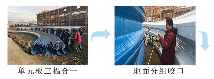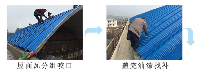 2.土建工程施工到檐口上皮標(biāo)高時(shí),應(yīng)按拱形屋頂構(gòu)造要求準(zhǔn)確留出所有埋件,下一工序轉(zhuǎn)交杰達(dá)鋼構(gòu)施工人員進(jìn)入工地進(jìn)行拱形彩板安裝,待做完通風(fēng)、采光及噴涂室內(nèi)保溫層后即可退出現(xiàn)場(chǎng)。