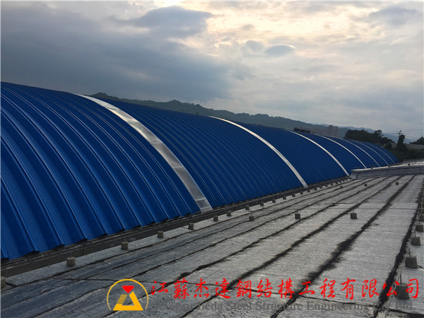 屋面材料選用了厚度為0.8毫米的灰藍(lán)色TS320GD-Z高強(qiáng)彩涂卷,具備較好的耐候性和美觀性。彩鋼板通過(guò)專用設(shè)備加工成型,保證了拱形屋頂?shù)木_度和安裝效率。