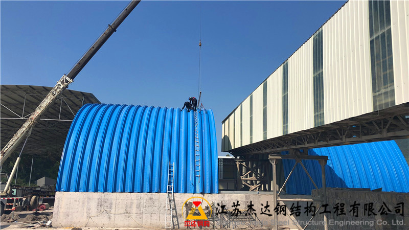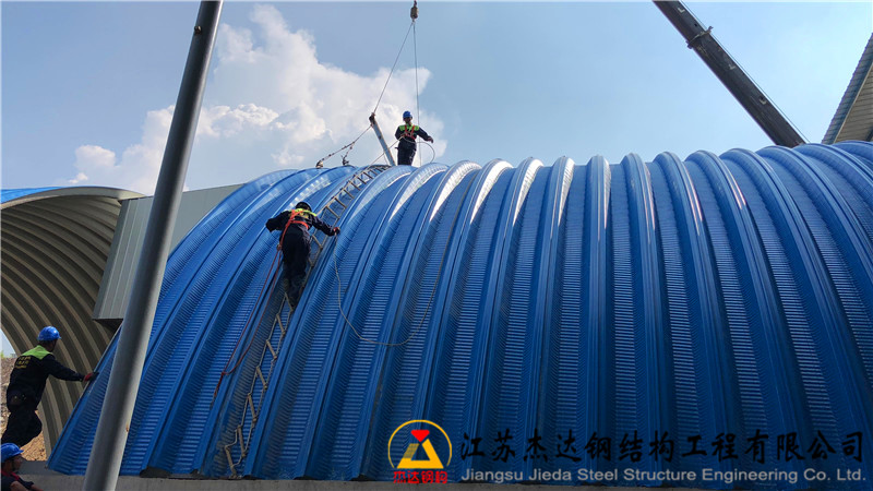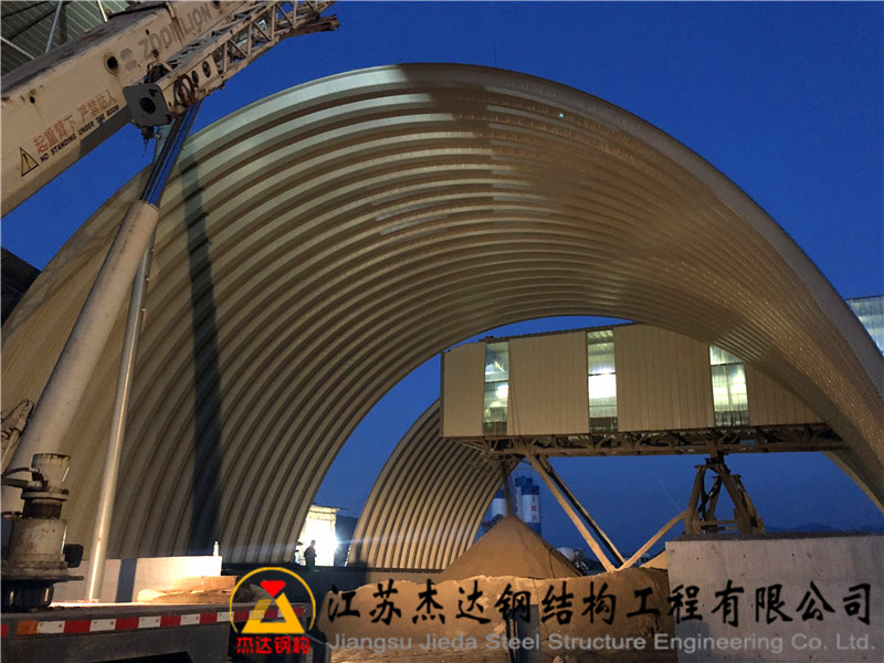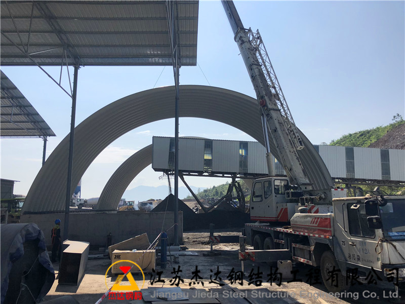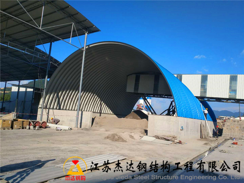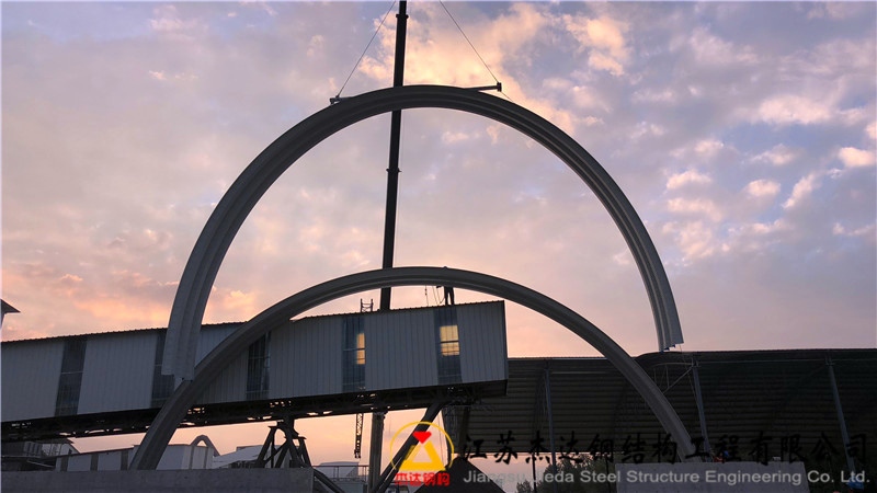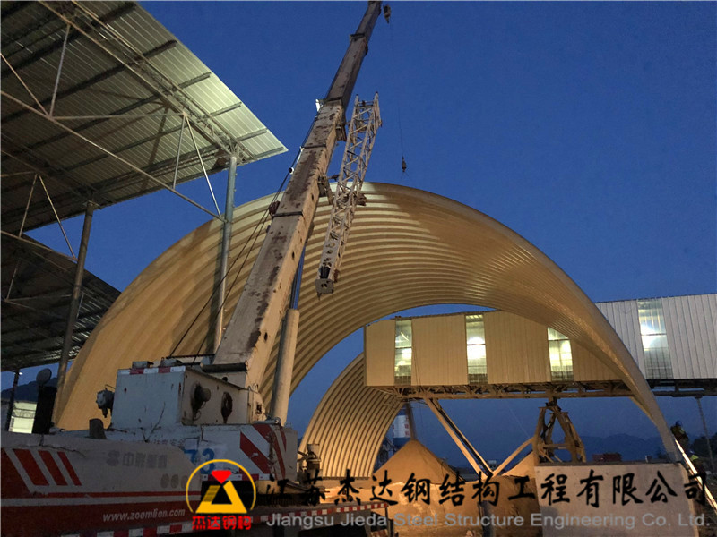 該拱形屋頂跨度約為19米,拱高8米,采用1.2mm厚的鋼板作為屋頂板材,下部連接板厚度為10mm。屋頂結(jié)構(gòu)比例協(xié)調(diào),拱高接近跨度的一半,造型優(yōu)雅,符合礦區(qū)環(huán)境需求。
