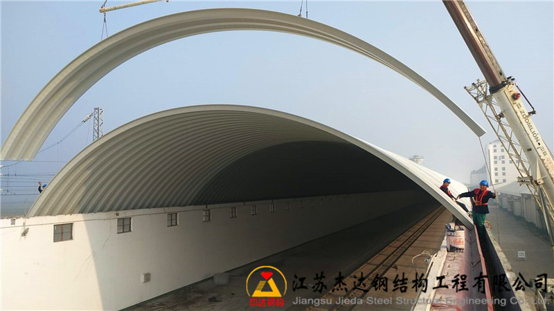 該工程的拱形屋頂位于河南周口紙店鎮(zhèn)內(nèi),主要作為中儲(chǔ)糧糧食儲(chǔ)備的罩棚使用。屋頂跨度達(dá)18米,拱高4.5米,結(jié)構(gòu)穩(wěn)固,功能明確。拱形屋頂兩側(cè)通過(guò)焊接在化學(xué)螺栓上的預(yù)埋鐵板固定,保證整體連接的牢固性。