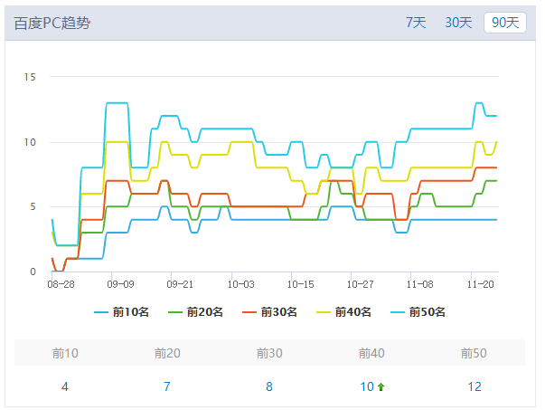 我查看了一下本網站百度PC趨勢90天的趨勢,目前來看從8月28號到11月20號,關鍵詞的排名陸續上升,在11月初的時候經歷了一段低谷期,現在還算比較穩定。