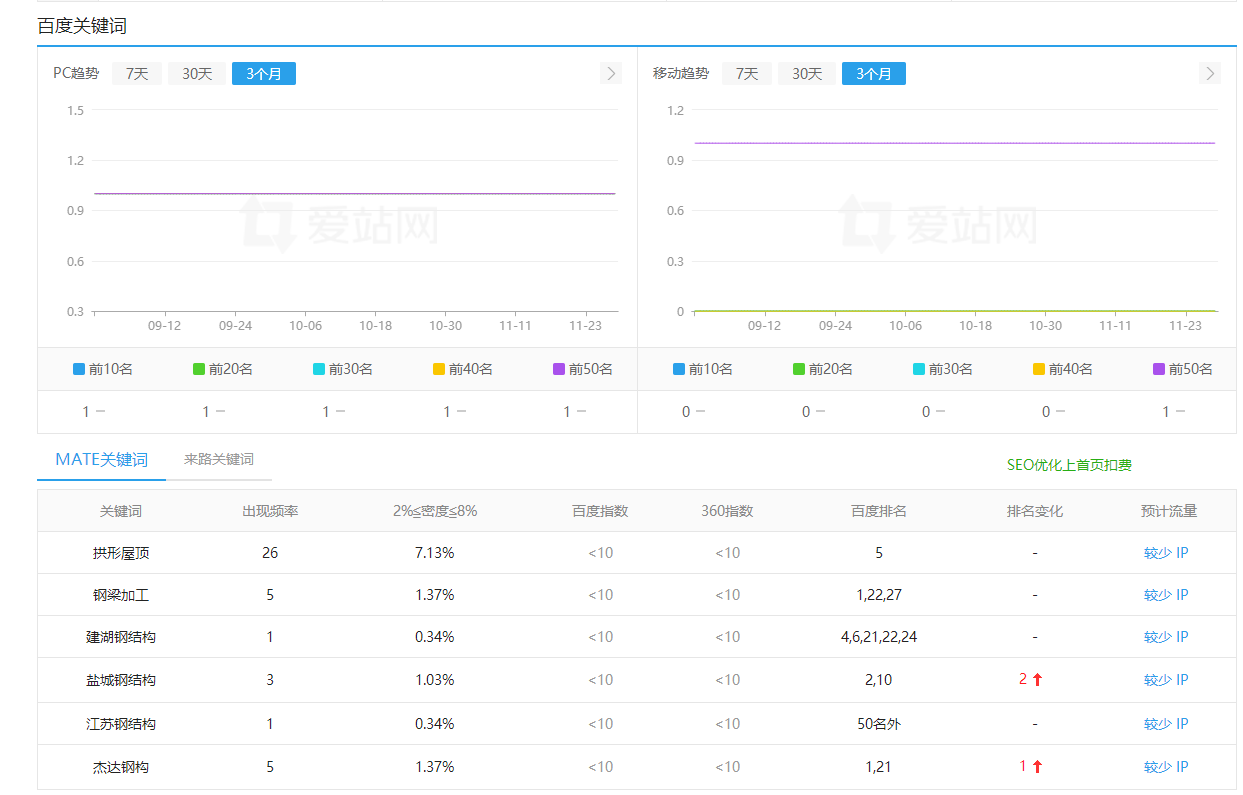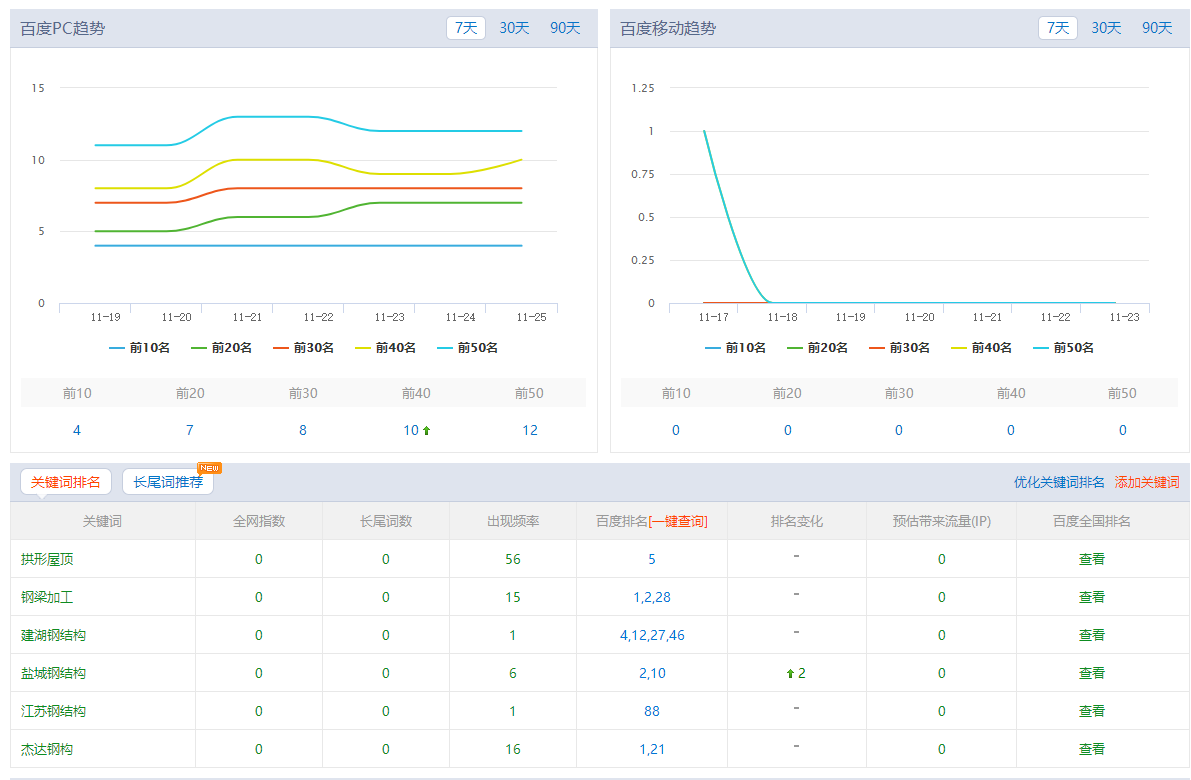 我們這個網站在前20名的關鍵詞有鋼結構新聞太空瓦拱形面和鋼結構梁,這幾個詞里面能夠變現的是鋼結構梁,所以對于鋼結構的鋼梁加工鋼柱加工,我們也要進行持續深入的優化。