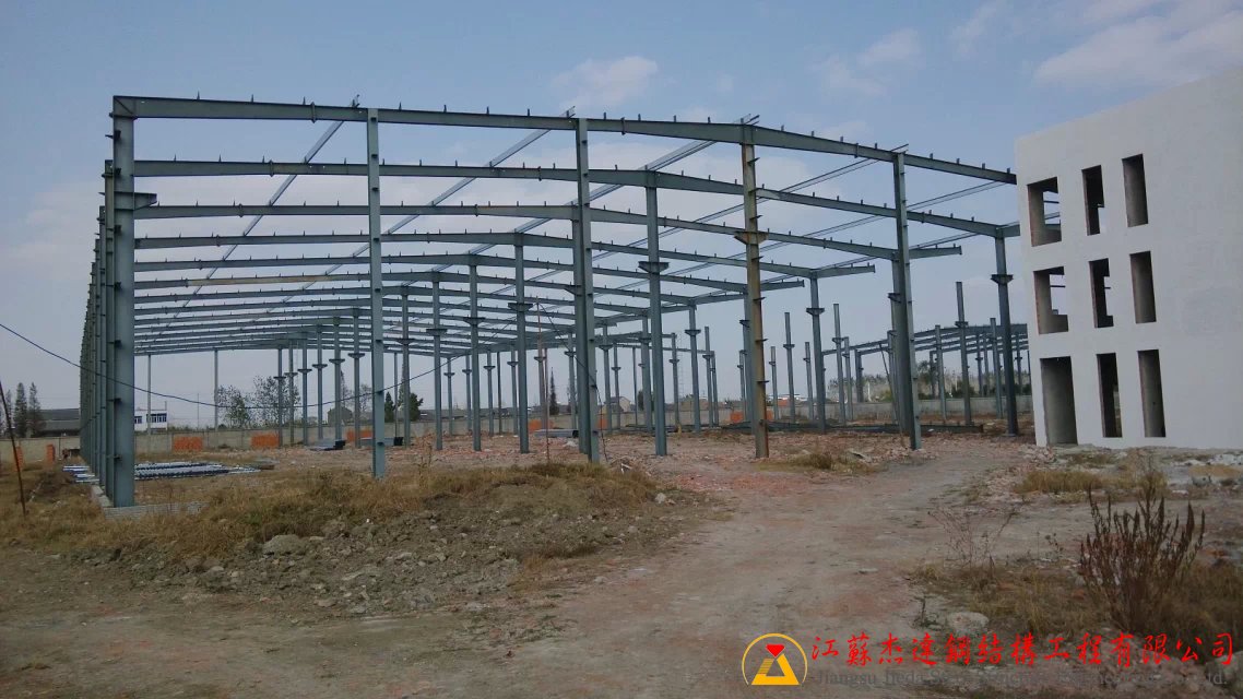 本工程為全鋼結構五連跨車間,采用多跨鋼架設計,確保空間利用最大化。主體鋼架部分由江蘇杰達鋼結構工程有限公司負責鋼梁的加工與制作,保證結構的質量和施工進度。